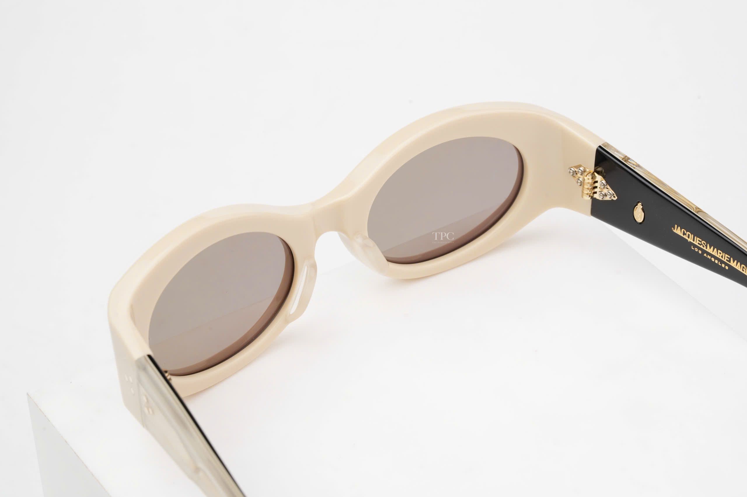 Chất liệu: Acetate đã xử lý màu trắng dày 10mm, với càng kính acetate ép hai lớp tùy chỉnh, tích hợp chi tiết kim loại quý Lens : CR 39 Light grey